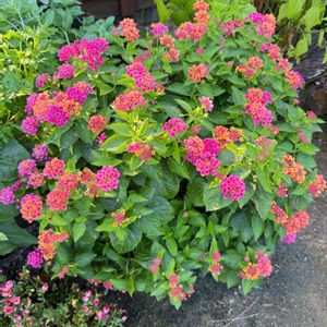 スーパーランタナ トロピカルサンセット 花数は減ったけど 色が濃くなって まだまだ咲いてます 2株あるランタナ ひとつつはオレンジ ひとつはピンク 大きくなってきた😄 気づいたら 秋になっていました😌 初投稿から3回目の秋 これからも マイペースで続けたいと 改めて思った朝です