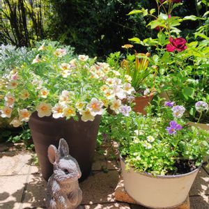 こんにちは😊🎶 朝は雨がぱらついていたのに、段々☀️出てきて、外で作業したら汗が👕💦 ミリオンベル ピーチマーブルがもりもりしてきました(*´∀`)♪ 右側の寄せ植えにしていたマトリカリア🌿梅雨入り🐌して、駄目元でカット✂️したらちょこっとですがお花が出てきました♪v(*'-^*)^☆