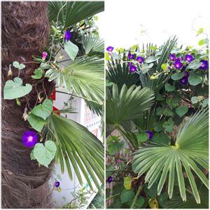おはようございます。☺会社のシュロの木に、からみついて、頂上に💙外来種?🍀青々して、花も、しおれない朝顔です。☺今日も、楽しくp(^-^)q🎵