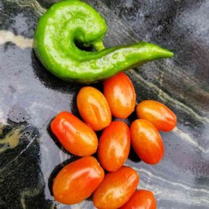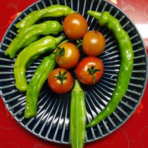 本日の収穫。 ミニトマトと万願寺とうがらし。 万願寺とうがらしの方が少し黒くなっています。