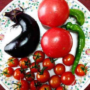 こんにちは☀ 一昨日も少し収穫したので少なくなりましたが。 本日の収穫です。 なす🍆。 中玉トマト🍅。 ミニトマト🍅 ししとう。 万願寺とうがらし。