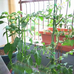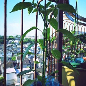 万願寺とうがらしとミニトマトの背丈が大きくなりすぎて、 ベランダの縁に置いてると風で倒れてしまうので、一旦内側で待機してもらおう しかしトマトはどうしたもんかな あんまり大きくなるとベランダで育てれなくなるぞ笑