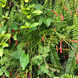 通り道沿いの空き家に 咲いています。 赤色で 釣鐘状です。🌺 どなたか 教えて下さい! 追記 はなちょうじ(ラッセリア) だと教えて頂きました。