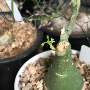 アデニア グラウカ 昨年10月、小枝の様な苗を購入 (H6cm) 今年2月に✂️剪定 (H4cm) 。。。。で、やっと動き出しました😊 可愛らしい葉っぱが ニョキ❗️ニョキ❗️です 良かったぁ~ 切りすぎたかとヒヤヒヤしました