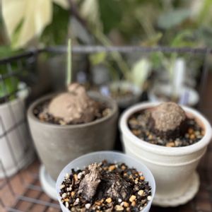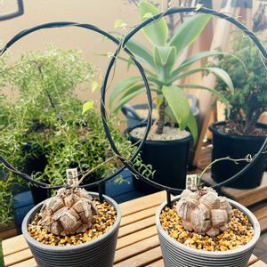 ステファニアついに✨ 🥔芋だけです!生やしたくて😌 で、鉢をずっと何日も探してるんですが、全然気に入ったのに出会えなくてまだ保留です🪴 取り急ぎの鉢、しかもメインがプラです、😂 植え替え直後なので芋湿って乾かし中です 1.ステファニア達 2.ステファニア カウィーサキー(手前)メイン 3.ステファニア スベローサ(奥右) 4.5.ステファニア エレクタ(奥左) 呼び名も色々あるみたいですが、購入した先の呼び名で ✤ステファニア カウィーサキーの青っぽい大きな丸葉に魅せられ ずっと探していたら 芋買付けしてる方に出会え やり取りが始まったのですが 直接出来たことで有り得ない価格で購入できたんです🤣🙏✨ 一個じゃ心配なので、小さめの可愛い葉っぱのエレクタも欲しいと伝えたら これまた破格😍 そして葉のサイズ大き目でまた雰囲気の違う葉の スベローサをオマケで付けてくれたんです!🤣🙏 発根済だし良い方に出会った✨ 荷物受け取った時はズシッと重…エレクタがまさかのこのビッグサイズ! 茎をよーく見たらいくつか葉が出るのか出ないのか… 来季に期待して、過保護に見守っていこうかな🥹💚 とにかく鉢を探さなきゃ😌 しばらく買い物はしなくていいなんてつい最近言ってましたが 無理でしたね、 これで本当にしばらく買わない笑 あ、でも今度こちらのタネが欲しくなってます🤣