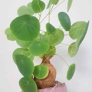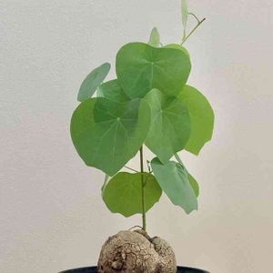 植物名:ステファニア スベローサ 科名:ツヅラフジ科 属名:ハスノハカズラ属 原産:タイ、マレーシア [サイズ] 全体の高さ:88.0cm 全体の幅 :30.0〜40.0cm 鉢の高さ :20.5cm 鉢の外径 :23.0cm 皿の直径 :25.5cm 受け皿素材:アイアン(防サビ加工) [育て方] 日当たり:明るい半日陰 水やり :葉が展開する成長期には土が乾いたら、底穴から水が抜けるくらいたっぷりと。受け皿に水はためないように。 落葉後は休眠期に入るので、断水。 置き場所:日当たりが良く、風通しの良い明るい室内〜屋外(夏の直射日光は避ける) 耐寒温度:5℃〜10℃ 美しい網目模様の芋と長く伸びたつるをぐるぐるっとまとめた先にハート形のかわいい葉がついた塊根植物、ステファニア スベローサ。 冬は室温では落葉しますが、春になるとまたつる状に長く伸びてかわいらしい葉をつけてくれます。 明るい日陰を好みます。葉焼けを起こしますので強い直射日光は避けましょう。 室内の明るい場所で栽培できますが、蒸れないよう風通しの良い場所を選んでください。 ナチュラルなpotでコーディネート。 塊根の魅力をひきたてています。