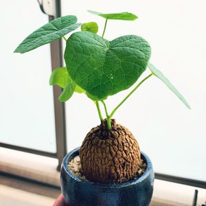 ◆ Stephania suberosa ◆ ・ 夏に突如ツルが枯れてきて一時、ハゲましたが、最近新たに頭から生えてきたスベローサ君。 そんなスベローサ君を手に乗せて記念撮影。