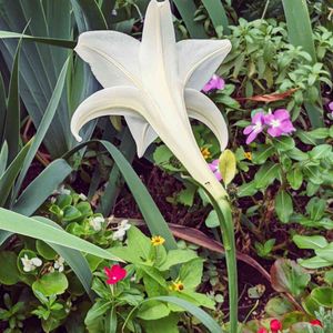 白色がとても綺麗な シンテッポウユリ 駅のバス停留所前の花壇にて 2021年8月31日撮影