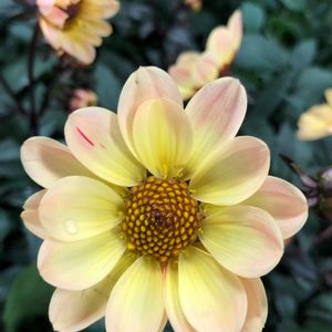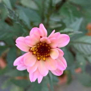 おはようございます😃 プチダリア ハミングブロンズの花が 咲いていました🌼 花言葉は「華麗」「端麗」「優雅」… 外輪は薄いピンク内輪はイエローで 可愛い花でした^_−☆ 4/10月9日のpic📸