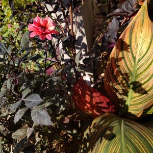 今日のお花*ダリア 銅葉プチダリア🌿 ハミングブロンズ ✨エターニティ カンナの葉に映る、ダリアの葉っぱの影が綺麗だな🌿❇️✴️