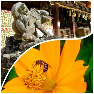 オケツの日参加します。🔰 百名山の⛰️1つ筑波山を御神体として祀られる筑波山神社拝殿に向かって左側の狛犬様 獅子タイプで、今にも動き出しそうな躍動感あり✨ 臀部~大腿部にかけての立派さに👀が止まって… 散歩道で出逢ったキバナコスモス&朝御飯中の蜂さん