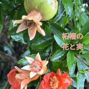 お向かいのお宅の柘榴の花と実が見過ごせない 雨の中今年も美味しく実るよと、期待が膨らむ 昨年も大きな実をお裾分けしてもらいました