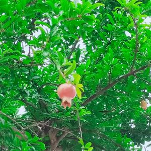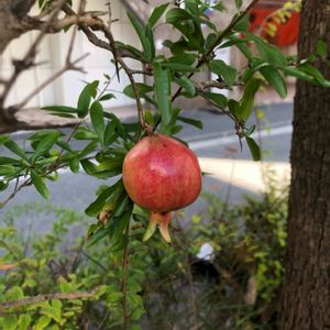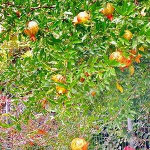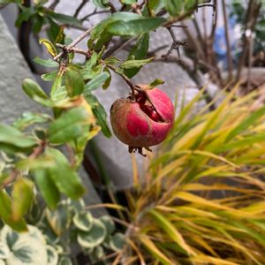 ザクロ(柘榴)の木です。 ザクロは果実が多い事から古代ギリシャ・ローマでは豊穣、中国では子孫繁栄のシンボルとされました。安産、子育ての神様である鬼子母神が手に持っていることでも知られています。