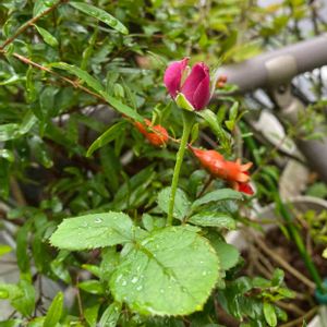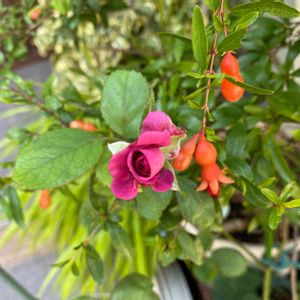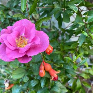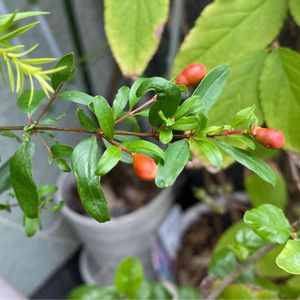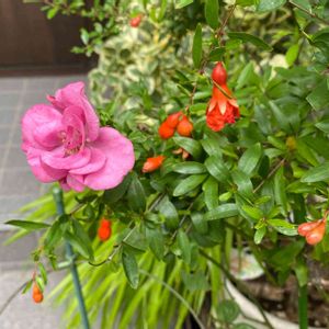 玄関の軒下で難を逃れて... ミニバラと姫ザクロの共生です。