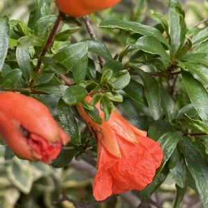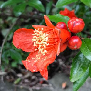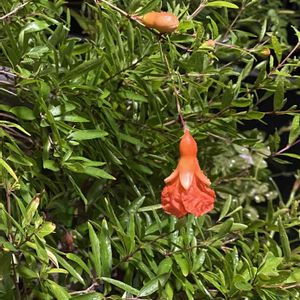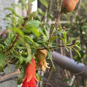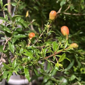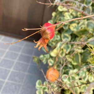 今日のお花『ザクロ』 植え替えを考えつつ数年そのままのザクロ! 鳥からの落とし物が山野草の花壇に育ち過ぎました❣️ 昨年秋に半分に✂️したのに既に丈50㎝に‼️ 葉がツヤツヤと綺麗ですが、生えた場所が迷惑でした!✨