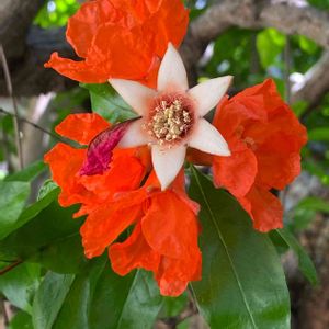 今日のお花、柘榴(ザクロ)🍀 向陽山光栄寺で、出会いました😄 沙羅の花が咲いていると教えてもらい、訪ねてみましたが、残念ながらちょっと遅すぎでした🥲 そのかわり?、ずっと見てみたいと思っていた、柘榴の花に遭遇😍 初めは何のお花なのか、解りませんでしたが、高い所に咲いていた、この一枝で柘榴だと気づきました☺️ 緑の葉と鮮烈なオレンジと白の、魅力的なコラボレーション🧡💚✨😊 2022/5/25 撮影🍀