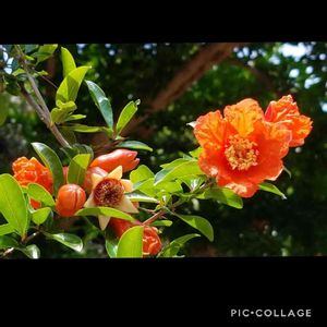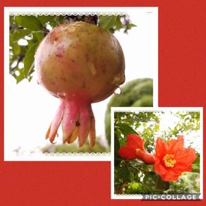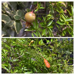 今日の柘榴です✨ もう見た目🐙ウィンナー時期を過ぎてしまいましたが、幾つか、遅咲きのお花があって落ちていた🐙ウィンナーを大きく熟している途中の柘榴に乗せてみました。 親子に見えますか? 帽子に見えますか? 大きさがわかりますか?結構、成長してきています♡♥