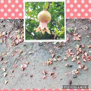 これ、柘榴(ザクロ)です。 んーーーー( -᷄ω-᷅ )💭殆どお花が落ちている・・・地面を撮ってみました。 残った柘榴を大切に観察します。