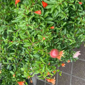 ここまで成長しました柘榴(ザクロ)。🐙タコさんウィンナーの様だった形も頭が大きくなり宇宙人の様になってきています(宇宙人見た事ないけど😅)一時は、沢山のお花を咲かせてくれましたが、ほとんど雨風に落ちてしまい 残ったのは数えるくらいしかありません。 今朝は、今は実になっている時なのにお花を発見♡♥しました。