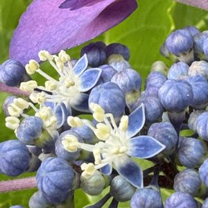 コアジサイ 林内の小さな流れのそばに、煙るような水色のかたまりとくればコアジサイだ🔵 一つ一つは花は小さいが、それぞれ10本ある花糸は青く、花弁よりも突き出るので全体が青くみえる 水曜日は水色🏷️ ガク片が大きくなった装飾花はなくて、みんな種が出来る両性花はブーケのようにこんもりと咲く💐