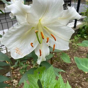 *テッポウユリ* 昨日、蕾だったテッポウユリさん、 今朝、一輪咲いていました。 白いユリ、清々しいです。💚