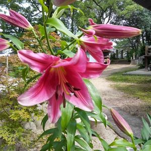 軒下に並べられている鉢植えのユリ達🌱 スカシユリが咲いて次のオリエンタルユリ、テッポウユリが待ちかまえてます☺️