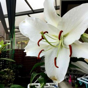ユリ ちょっと成長がよろしくなかったんですが咲きました 本当は薄いピンクのユリですが色が薄くて殆ど白に近い色になってます