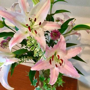 うちにある植物ばかりで飾ってみました。ピンクカサブランカはゴージャスです。