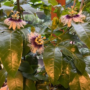外は大雨 何事も無く通り過ぎて来れますように🤲🥺 2年ほど前に挿木をして鉢で育てて来たクダモノトケイソウ(パッションフルーツ)です大雨警報がでたので、玄関の中に避難させた所 花が三つも咲いてくれました☺️ 嬉しくて部屋での撮影❣️ これから受粉してみます。 実が付けば良いのですが? 楽しみです😄