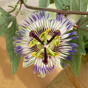 パッションフルーツの花。 横からパチリ📷 本日の開花は2輪だと思いましたが、母から3輪との指摘が😅 大きな葉に隠れていたもう一輪、発見しました。 昨日に続いて、本日も3輪でした。 明日も楽しみです。 蜂が3匹ほど、パッションフルーツの周りを飛んでいるから、受粉してくれているかな。 実がついたとしても、冬に突入して食べられないだろうから、ヒトの手による受粉はしていません😅 自然に任せます🤗