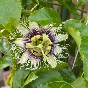 パッと見👀トケイソウ。だけど、 パッションフルーツです❣️ お野菜を買いに行った先のお店で、 わぁGSでよく見るトケイソウだー💕😃って寄ると、 パッションフルーツの名札が😲 トケイソウ科トケイソウ属、別名、果物トケイソウだそうです。 育ててみたい!モチロン食べるし! と、つい連れて帰りました(^。^)いつ熟すのかな〜😆