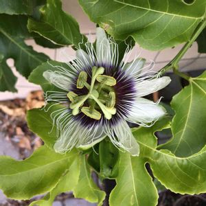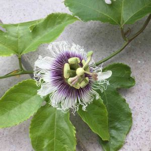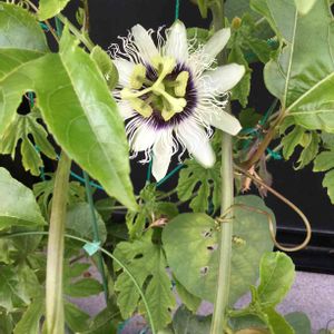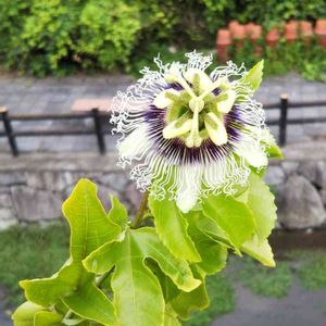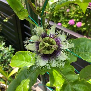 パッションフルーツ(果実時計草) 先月に実付きで買ったパッションフルーツにお花が咲きました。 近頃雨続きで水やりをサボっていたので咲くところを見逃して仕舞いました。 実はシワになったら食べて良しとの事でしたのでまた食べてません。 どんな味なのか、この花も実になるのかわくわくします😃💕