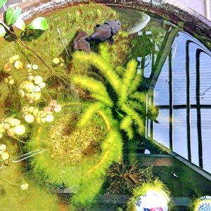 ~黒ちゃん登場🐠~ 冬の間は掃除しません。 苔が毛布と化します。薄氷が張っても大丈夫✨ ※水草の鉢植えは溶けても捨てないで下さい 春にまた芽吹きますから🌱 メモ📝 No.88 ピグミーサジタリア 10年前購入 黒らんちゅう 2016年お迎え