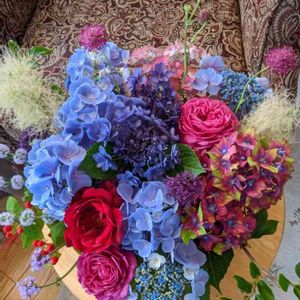 今日の収穫 雨で倒れた夕霧草を大量に ✂️。と咲いてしまったバラと 夕霧草は濃い紫と薄い紫といれました。目立たないけど〜!