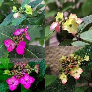 シェードガーデンのヤマアジサイ。 日向はそろそろ終わりそう。😢 左から 斑入りのヤマアジサイ 名前知らず 天主の紅 紅 #ootakanomori_garden