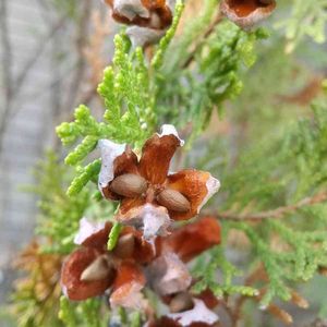 7月に名前を教えて頂いたコノテガシワです。 コノテガシワはヒノキの仲間で芳香成分が多くて香りを感知しやすい木だそうです。 そして、自律神経のバランスを整えてくれる効果があるそうです🍃☺️💓 睡眠に不安を感じている方はこの香りを嗅いでみてね。実でも🆗だって💓自然の癒し効果の効き目は?😌🥱😴 11月25日に三重県民の森を散歩している時にコノテガシワの実がはちけ中から種が覗いているのを見つけました。 右側真ん中のpicの中を覗いてね👀 小さな種が3個入っています。 本来は4個入っているそうですが1個下に 落ちたのかな?