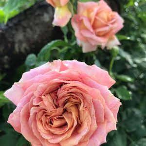 夏はヘンテコな花を咲かせてギョッとしましたが、病気に強く今は中大輪ピンクオレンジの忽滑谷さんらしい花姿を見せてくれてます。