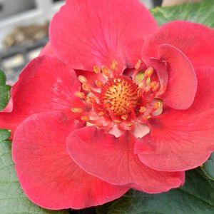 赤いイチゴの花 こんな鮮やかな種類があるって知ってました? 赤花いちご、ローズベリーレッドだったかと 実はふつうサイズですが…普通のいちごです。ちょっと酸っぱい… こうゆう変わり種のいちごもいます