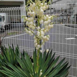 キミガヨラン 今花どき? 今日は2カ所でキミガヨランの花を見ました 以前見かけた場所では、3本咲いてます 青空に良く映えて綺麗でしたが、電柱とフェンスが邪魔 😁