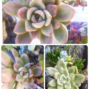 紅葉前(右下↘️)の淡いグリーンの色に引かれて多肉植物の寄せ植え教室の時、真っ先に選んだアボカドクリーム💚 可愛く紅葉してきて、おまけに👶🌱を背中におんぶしてました(左下↙️)(*˘˘*).。.:*♡ウレシイ〰️💗
