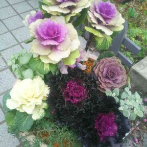 今日のお花…葉牡丹‼️ この前の休みに松フラさんに行ってチョイスしてきました💚💜💗 今年はビオラやパンジー、アリッサムは封印して…カラーリーフと寄せてみました(๑ºัºั๑)♡