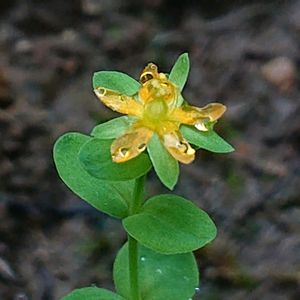 🏷️のんびり 🏷️小さな花 他に参加させていただきます 撮影は8/25日で2枚目はかなりのピンぼけで申し訳ありません コケオトギリ(苔弟切) オトギリソウ科オトギリソウ属の一年草または越年草 日本全土の水田や野原の湿地などに生える 高さ3〜10cm 茎は4稜あり傾伏して立ち上がり下部から分枝する 葉は黄緑色で薄く円形〜広卵形 花期 7〜8月 花弁は5個で長さは2.5mm 本当に小さいです 因みにミゾカクシは花の径は1cmとの事です 写真だけで大きさの違いがわかると思います もっと小さなヒメオトギリは葉の先が尖るそうです コケオトギリに戻りますが 雄しべ5〜20個、花柱は2〜3個 初冬にムカゴをつけて芽を出し越冬するそうです 一年草の場所は越冬できないのかもしれません ピンぼけ写真で失礼致しました🙇♀️