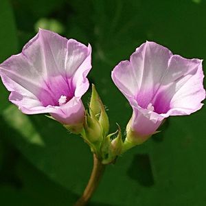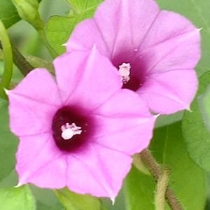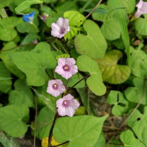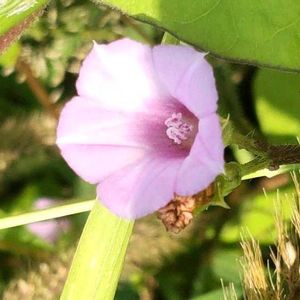 星朝顔(ホシアサガオ) ヒルガオ科サツマイモ属の一年草。北アメリカ原産の帰化植物。1945年以降に渡来してきたと推定される。日当たりの良い草地や荒れ地などに生える。葉は卵円形で先は尖る。葉が3裂するものもある。花期は8~10月。花は淡紅色で中心部が紅紫色を帯びるものが多く、直径1〜2㎝の漏斗形。花柄にはイボ状の突起がまばらにある。果実は蒴果。やや縦長の球形。 15年ほど前はまれに見られる程度であったが、現在は全国に蔓延。とりわけ東海地方以西では畑地で猛威を振るい、作物の品質を著しく損なうとして嫌われてきた。拡散・定着が早く、今では関東以北でも畑や道端で普通に見られる。 花弁に裂れこみがあるので真上から眺めると星のような形に見えるのが名前の由来。 出典『野に咲く花』『夏の野草』『日本帰化植物写真図鑑』『帰化&外来植物見分け方マニュアル 950種』
