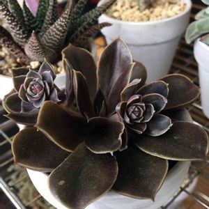 Echeveria Rosularis エケベリア ロスラリス 別名ブラックローズというらしいのですが、 ラメがはいって微妙な色合いで、 最近気になる子です🎶 葉がまだ薄くてすぐシワシワ🌱になるので、 しょっ中、葉をむしってます😆 むしってもすぐに新葉がでてきてくれる こーいう強い子が大好き💕 私のような初心者🔰向けかも👍