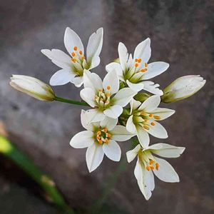 ハタケニラと教えていただきました 花期は5~6月 白色の6弁花 淡紅色の脈が花弁の外側に入る 50cm程の花茎の先端に、10個前後の花を房状につける(散形花序) 花は全開しない 雄しべは6本 花糸にひれ(翼)を持つ 基部は淡緑色 葯は黄色 細長く扁平で柔らかい葉を数枚出す にら臭はない 種子は黒く、艶とシワがある 鱗茎と呼ばれる塊状の球根で増える ………そうです♪