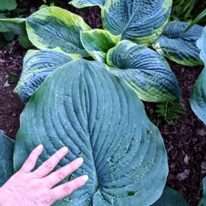 フランシスウィリアムズ の実生と思われる株です。 写真だと分かりにくいのですが……緑一色ぽいですが時折、ブルーグリーンぽく見えるので…、そう仮定させて頂いております。 大きさの参考に手を乗せて写真を撮りました。 サムアンドサブスタンス並みの大きい葉🌿です。親のフランシスウィリアムズを飲み込む勢いの成長の早さです。今の時点で幅100cmはあると思います。我が家の実生株ベスト株で今後の成長が楽しみです。