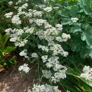 白いノコギリ草🤍 後ろの方にぼやけてる🧡花は マリーゴールドです。 来年はマリーゴールド沢山植えようかと🧡🧡🧡🧡🧡