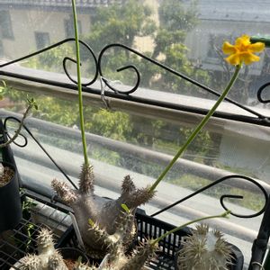 蕾つけてから1度折ってしまい 次の花芽をずっと大事に育てていた ドラ兄(パキポディウムドラケイ) そろそろ咲きそうだと朝に走って見に行くと あっ咲いてるー🌼 パカーじゃないけどま。いっか〜👍 まだまだ咲きそうなパキポさん待機中"( ू ⦁ω⦁` ू )"チョコン ん?🕸蜘蛛の巣🤣💦 🧹ヾ(・ω・ )サッサカサッサカ