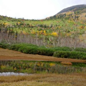 浮島湿原の池塘が鏡に 山の紅葉が映っています