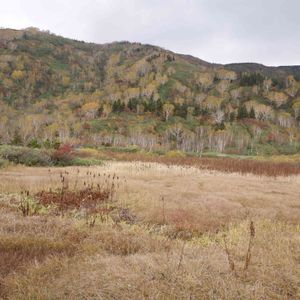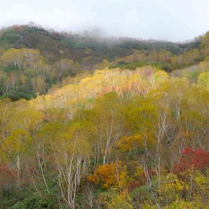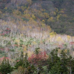 ダケカンバの黄色 オオシラビソ(つがの木)の緑色 2021.10.8ミズバショウ湿原